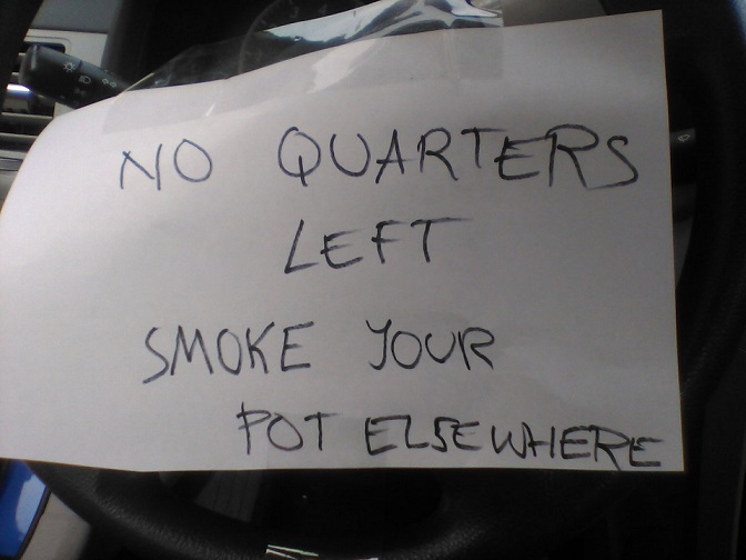 So I took a nice deep breath, the smell of Fabreze not quite having erased that other scent, yearning for that balance in a world gone to pot! I forgave the stupidity of whoever broke into our car, a person who obviously needed a nice cozy place to smoke a joint in the middle of the night. I picked the joint up and threw it out the window, making sure to use a little Purell to clean my fingers. Then, I picked up the empty $10 quarter-wrapper and put it in my pocket.