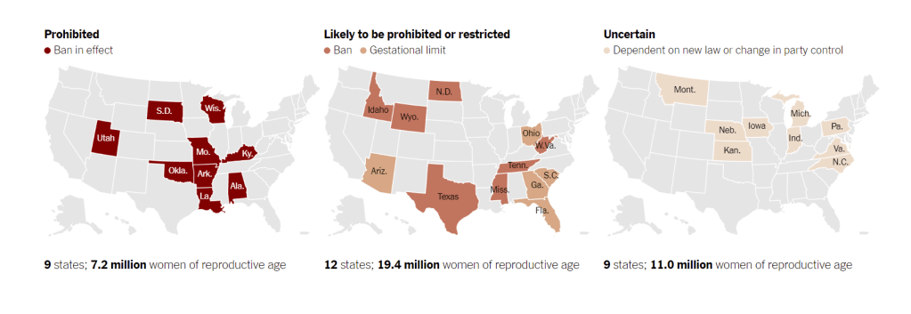 This New York Times piece tracks which states banned abortion today. And it tells us which states are on the way to a total ban or deep restrictions. This is a blow to human liberty. Those who voted in the SCOTUS majority be damned!